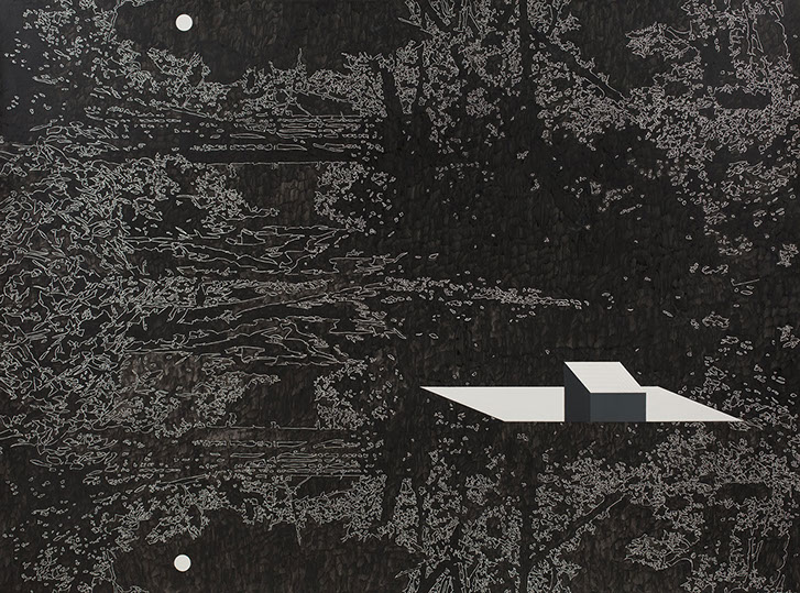 Large-scale drawings compositions and small acrylic paintings on wood form an optical Universe in which the visitor is invited to immerse himself. Whether open landscapes with architectural compositions or utopian constructions with enigmatic labyrinths and bizarre folds, ambiguity, and ambivalence dominate Kapnisis's black-and-white world.