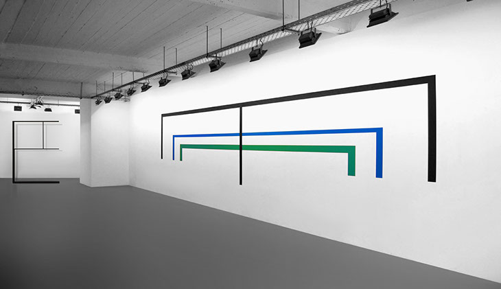 The present exhibition attempts to reconstruct a spatial event where viewers are invited to experience human pain based on the semiotics and the logic of a crucifixion. Works of identical dimensions, laid out so as to engage in dialogue, narrate conditions of precarious balance without any descriptiveness. Black lines trace boundaries, decisively cross the canvas from end to end and touch a blood-red parallelogram, palpating the wound of human transience. The canvas is always there, all-white and immaculate like reminder, like a holy shroud, to receive these interventions.