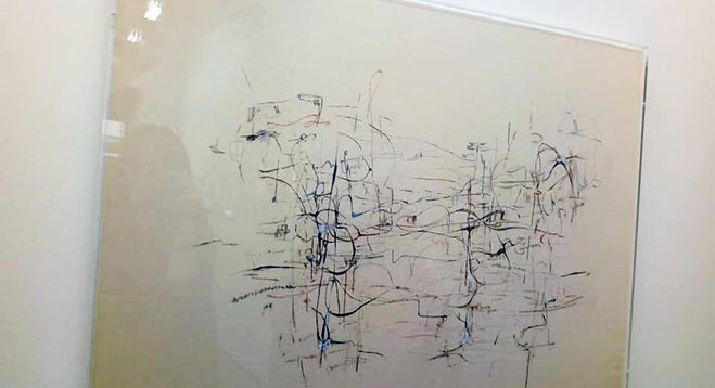 Μου αποκαλύπτει πως κάθε μέρα σημείωνε γι’ αυτό το πολυδιάστατο που ζούμε, πως θα μπορούσε να συνδεθεί, αποκωδικοποιηθεί σε αυτό που βλέπουμε. Σε αυτό το χειρονομιακό ημερολόγιο η κάθε μέρα την οδηγούσε στην επόμενη μέρα, ο ήχος, το τρύπημα της βελόνας και το σούρσιμο της κλωστής έδινε το τέμπο, στις σκέψεις που καταγράφονται αχνά με μολύβι, βίαια με μελάνη.