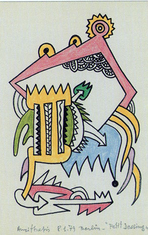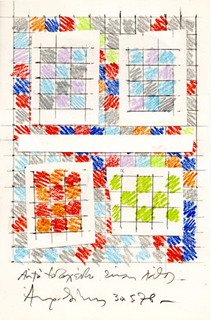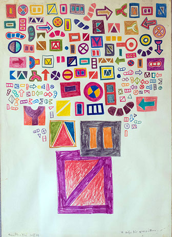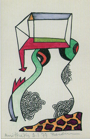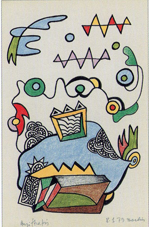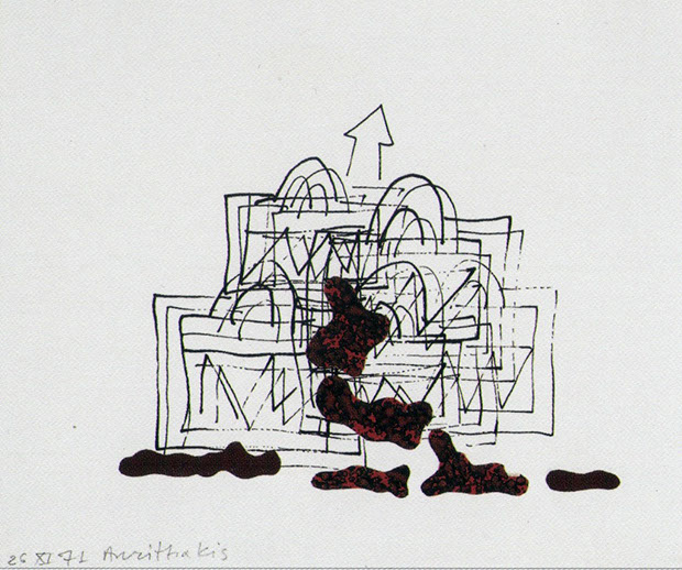 […]During the five days between May 28th and June 1st 1976, Alexis Akrithakis creates in Berlin a series of drawings depicting arrangements of little squares. The artist describes this drawings as “nothing new” and any kind of momentous declarations on the subject of art, are replaced by “In this way I am playing.” From the beginning of his career until the end of his life, Alexis Akrithakis , always restless, hadn’t stopped being opposed to any methodology or manipulation was attempting to alienate art from whom it really belongs to: the artist and his audience. Artistic creation for Alexis Akrithakis is integral part of his life and his art of life itself. His work, which just like the artist himself resists categorization and conventional classification, is sharing between writing and painting, proving that there are not only similarities and differences between the two but these are two faces of the same coin. Writing, painting, constructions with wood, iron and any kind of material needed are the tools and the means by which the artist creates during the ’70s the most recognisable part of his oeuvre.[…]