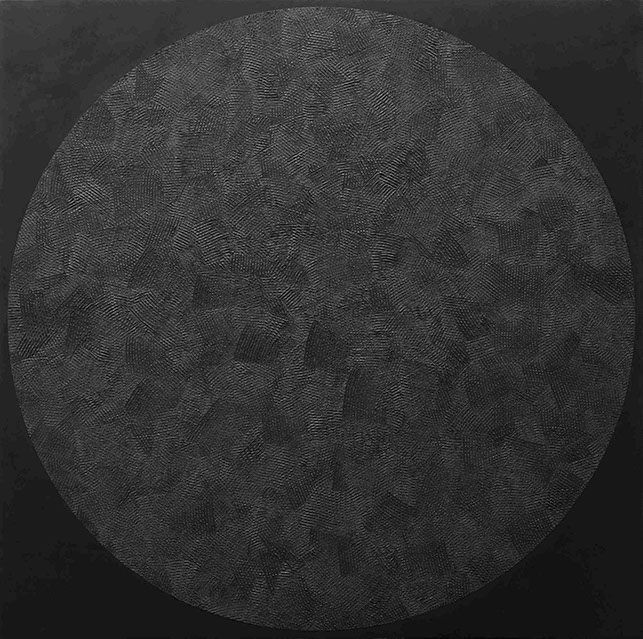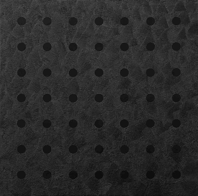 The basic forms (circle, squere, triangle) are systematically applied to large square canvases with only one color, black. Forms are created by making patterns of spreads on the thick layer of black paint. An additional impression of positive/negative is achieved depending on whether the spreads are applied to the background or in the forms themselves. These series of works are made by the multiplication of the forms within the canvases, as well as by the multiplication of the canvases, resulting in large conceptual works.