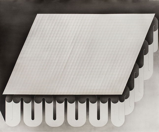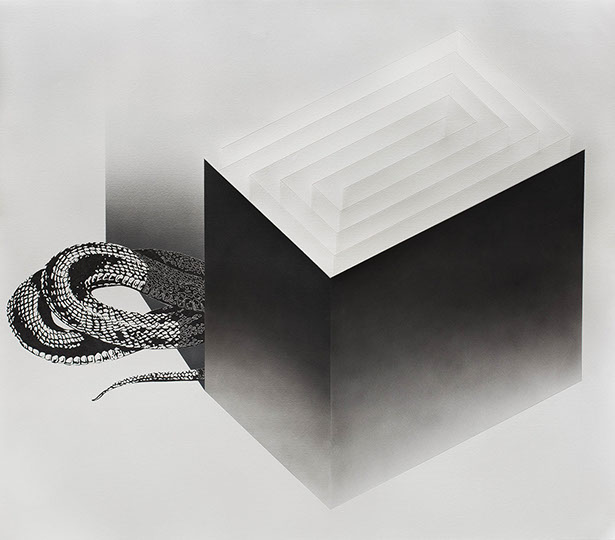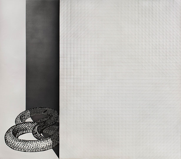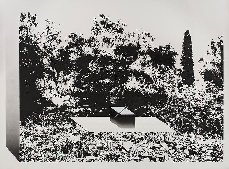 Large-scale drawings compositions and small acrylic paintings on wood form an optical Universe in which the visitor is invited to immerse himself. Whether open landscapes with architectural compositions or utopian constructions with enigmatic labyrinths and bizarre folds, ambiguity, and ambivalence dominate Kapnisis's black-and-white world.