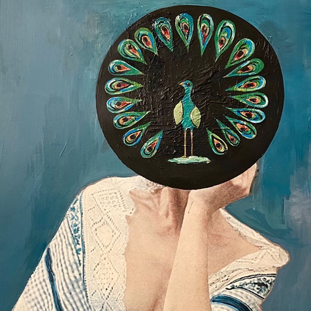 In addition, the artist revisits a series of rare postcards printed in France in the 1950s. She steals the identities of the semi-naked ladies pictured in these tiny glossy cards. She repaints their faces and replaces their eyes with a mask. As she gives them back their anonymity, she enters another dimension and slips into a different moment in time.