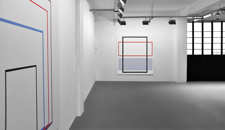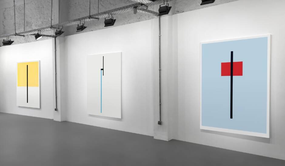 The present exhibition attempts to reconstruct a spatial event where viewers are invited to experience human pain based on the semiotics and the logic of a crucifixion. Works of identical dimensions, laid out so as to engage in dialogue, narrate conditions of precarious balance without any descriptiveness. Black lines trace boundaries, decisively cross the canvas from end to end and touch a blood-red parallelogram, palpating the wound of human transience. The canvas is always there, all-white and immaculate like reminder, like a holy shroud, to receive these interventions.