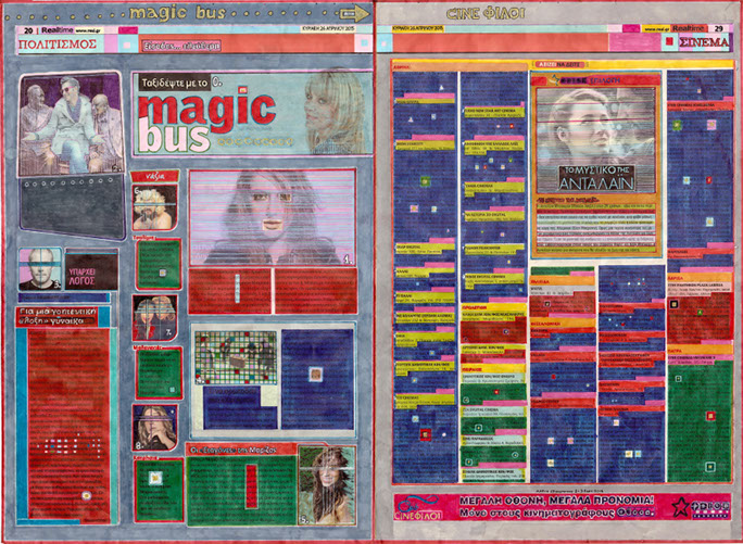 Reworking the printed page with colour, collage and drawing, deletions and additions, changed headings and distortions, Spiliopoulos comments on events and their reporting by altering the form and the content of printed news in an attempt to express his personal take on events and create his own narrative about recent history.