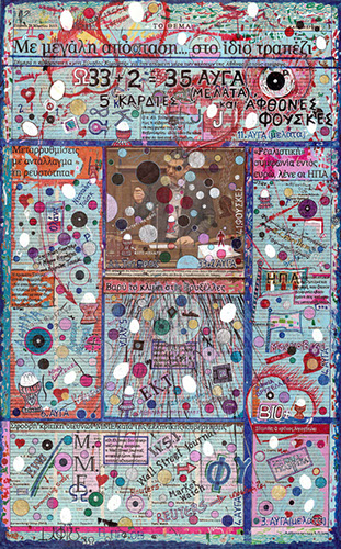 "…The painterly intervention of Marios Spiliopoulos on the newspaper sheets follows two paths: one of critical and subversive irony and one of selecting and highlighting the elements he deems to be important. In this way, each work is also a 'handmade newspaper' of his own. He focuses mainly on five subject areas: politics, ads for consumer gods—mainly food, culture, science and sports. While not exhaustive, this list includes most of the elements, the major or trivial events, that make up the current affairs, the everyday reality of all of us, the web that is weaved on a daily basis and makes up our life and our world… From this point of view, the exhibition is an example and a reminder to all citizens that no one can relieve them of the duty to think for themselves. This is the prerequisite of freedom and autonomy…"