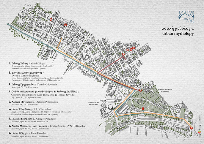 Στην έκθεση «Urban Mythology» 10 καλλιτέχνες καλούνται να δημιουργήσουν 9 εφήμερα έργα στο δημόσιο αστικό χώρο, σε διάλογο με την Ιερά Οδό –όπου στην αρχαιότητα τελείτο η Ελευσίνια πομπή– και τις όμορες γειτονιές του Κεραμεικού και του Βοτανικού που κάποτε φιλοξενούσαν σημαντικά μνημεία, τάφους, ιερά και ναούς. Στον φορτισμένο αυτό τόπο, πλούσιο από μύθους και αρχαιολογικά ίχνη, που σήμερα αποτελεί ένα ζωντανό πολυεθνικό μωσαϊκό γεμάτο αντιθέσεις, οι πρωτότυπες αστικές παρεμβάσεις των καλλιτεχνών, με τον εφήμερο και εύθραυστο χαρακτήρα τους, λειτουργούν ως σύγχρονα «αντι-μνημεία».